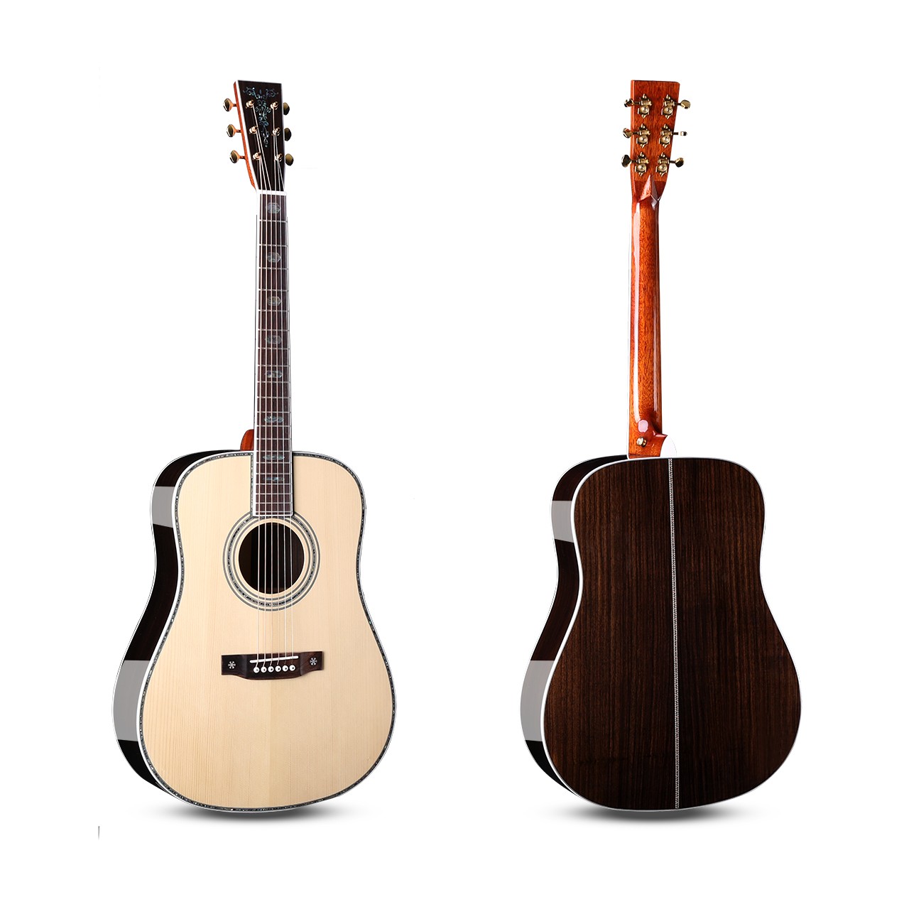 尺寸:41寸D桶&OM桶&GA桶 面板:A级云杉单板 背侧板:印度玫瑰木单板 面镶边:深海鲍鱼贝 琴颈:桃花芯 指板:玫瑰木 (镶嵌贝壳) 琴弦:磷铜镀膜-高抗氧化 琴钮:开放式高精度金色弦扭 琴枕:牛骨 油漆:高清亮光