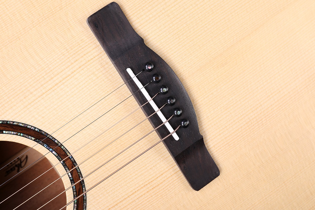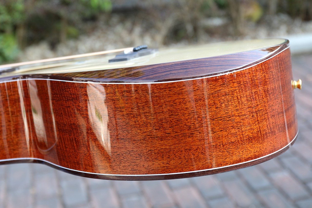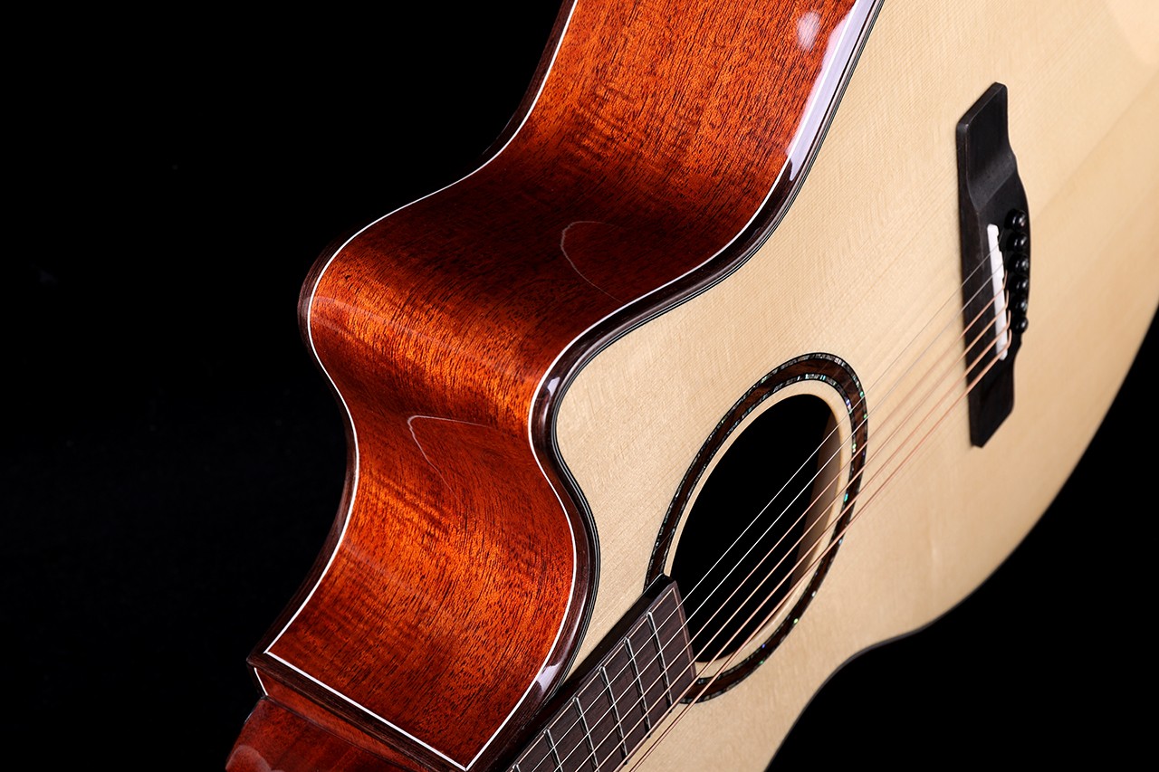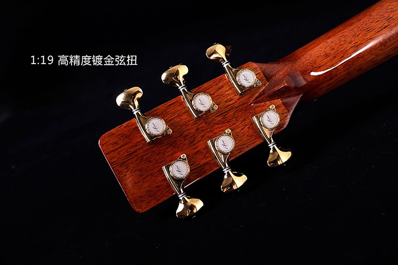 型号:DW-230G 尺寸:41寸 面板:A+欧洲云杉单板 背侧板:刚果虎纹桃花芯 口轮花:鲍鱼珍贝 弦钮:1:19镀金封闭式 指板:手工镶嵌(星瀚) 品丝:圆头品丝(无痛0品) 臂托:实木臂托 油漆:高清亮光 梁架:手工研磨