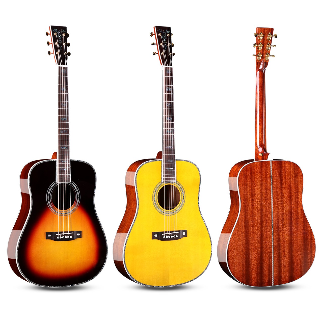 尺寸:41寸D桶 面板:A级云杉单板 背侧板:非洲桃花芯单板 面镶边:深海鲍鱼贝 琴颈:桃花芯 指板:玫瑰木 (镶嵌贝壳) 琴弦:磷铜镀膜-高抗氧化 琴钮:开放式高精度金色弦扭 琴枕:牛骨 油漆:高清亮光