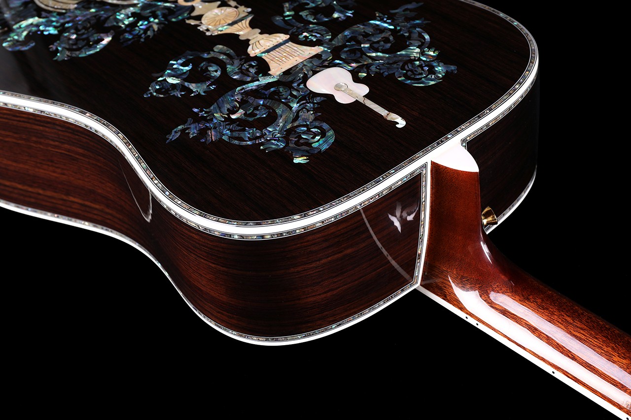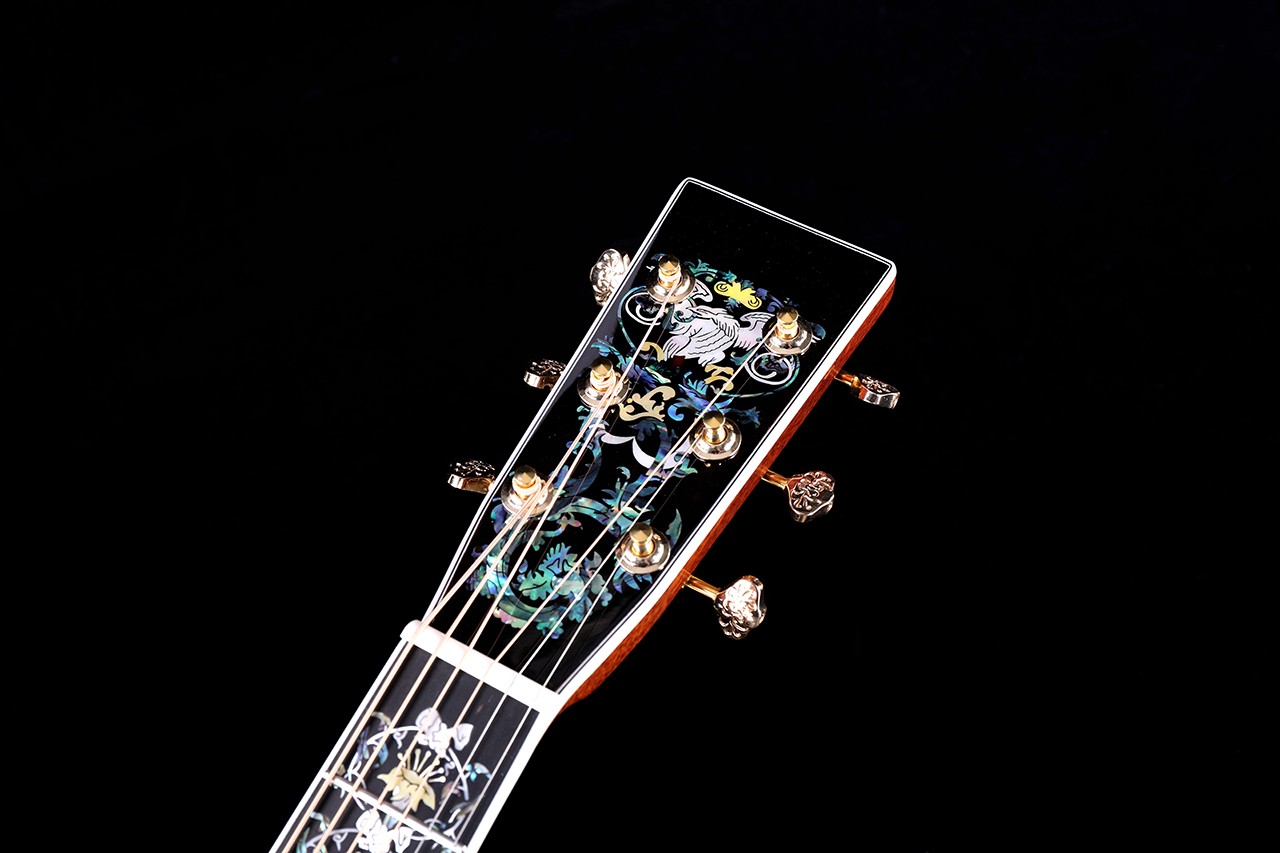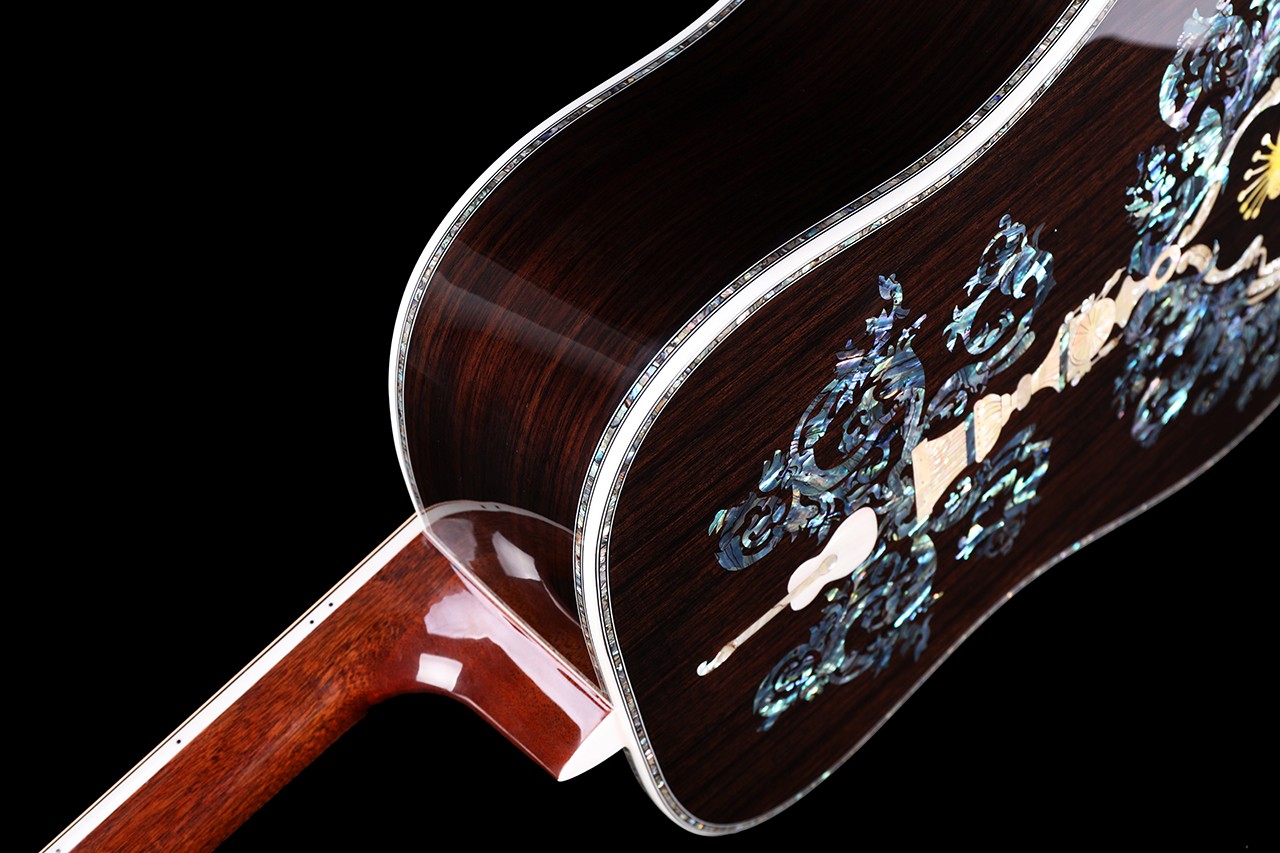 尺寸:41寸D桶 面板:AA级云杉单板 背侧板:AA级印度玫瑰木单板 镶边:面/背/侧板奢华镶嵌鲍鱼贝 琴颈:桃花芯 指板:乌木(原贝镶嵌) 琴弦:达达里奥-XS1253 琴钮:浮雕金色开放式(台湾德荣) 琴枕:牛骨 油漆:高清亮光