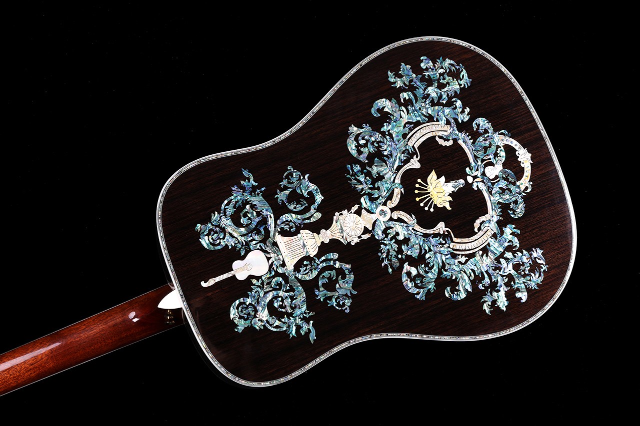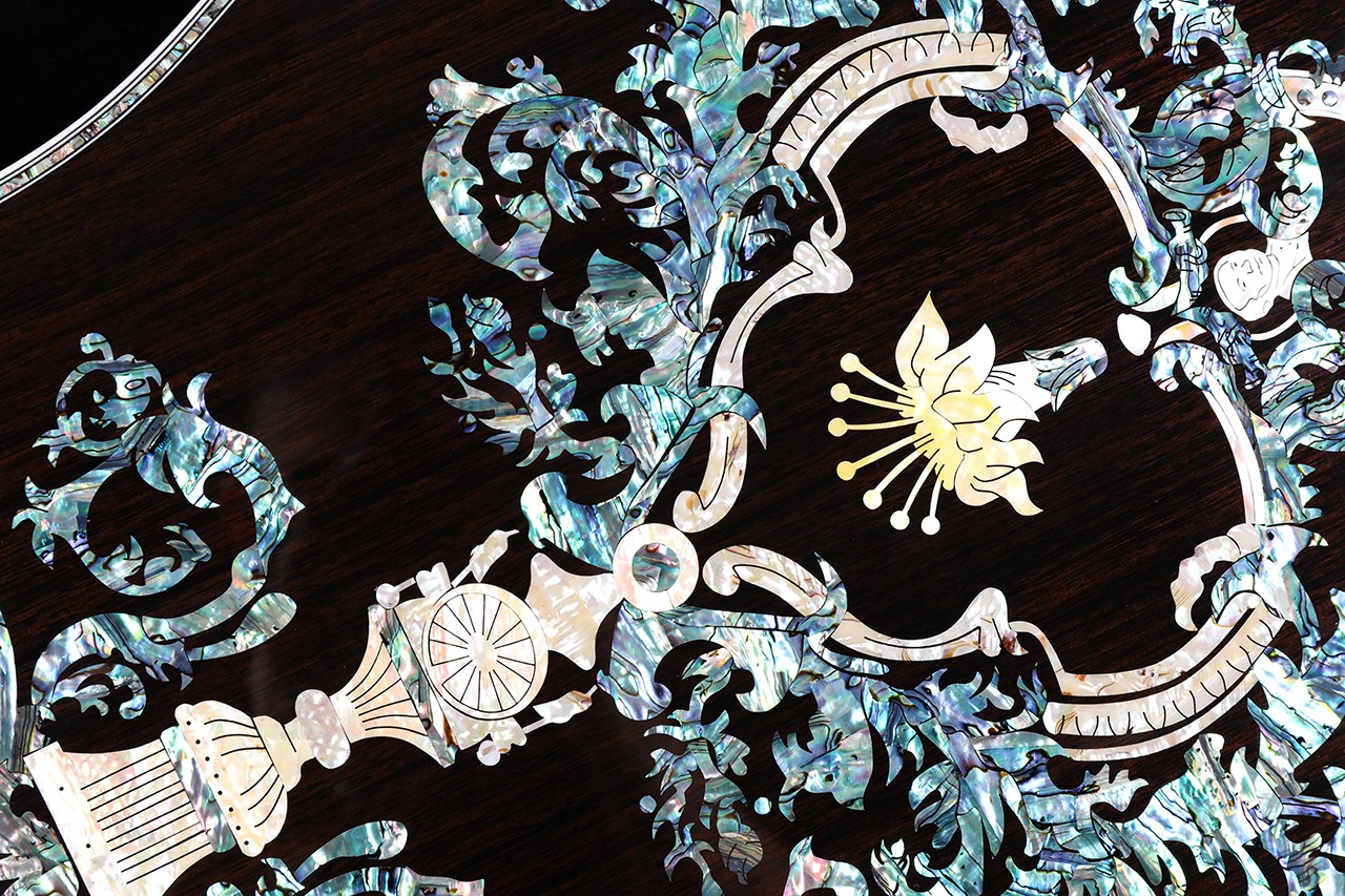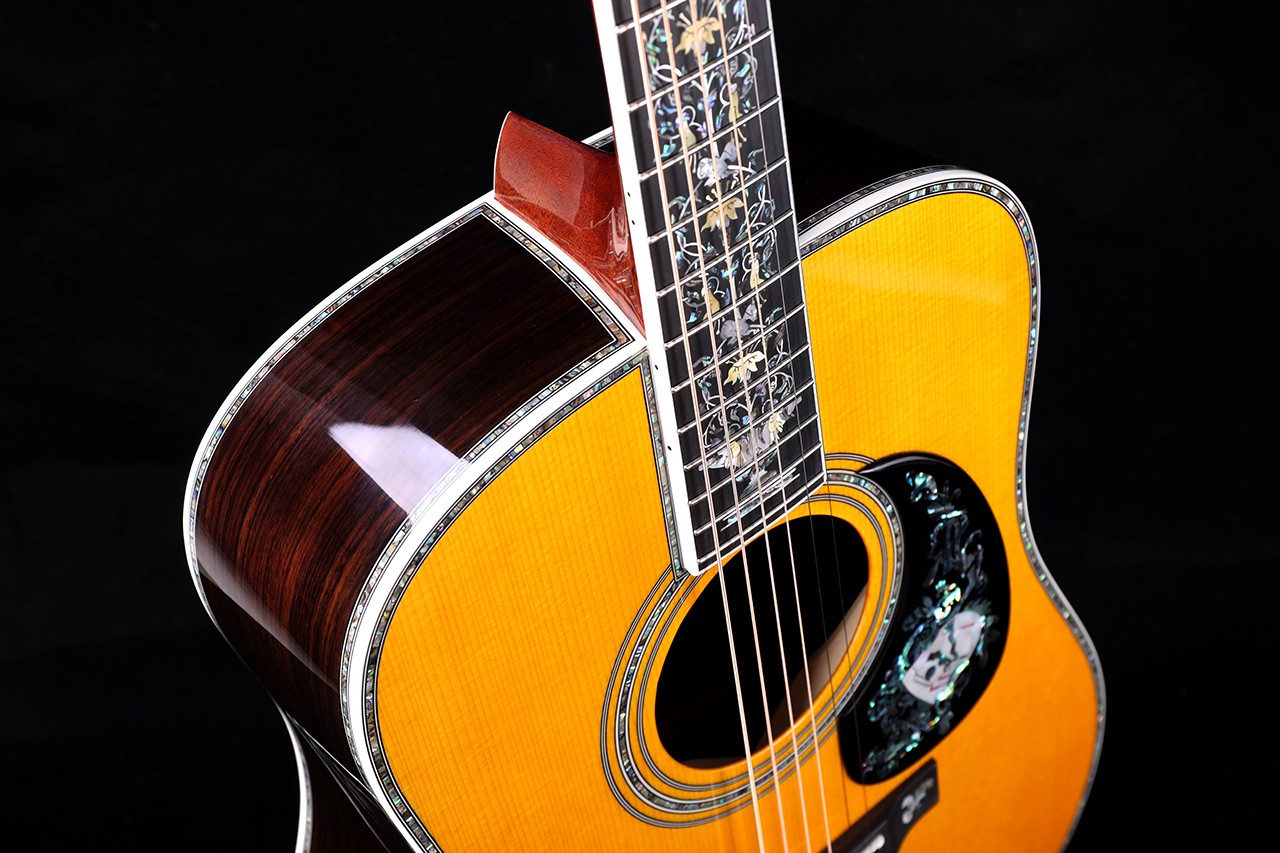 尺寸:41寸D桶 面板:AA级云杉单板 背侧板:AA级印度玫瑰木单板 镶边:面/背/侧板奢华镶嵌鲍鱼贝 琴颈:桃花芯 指板:乌木(原贝镶嵌) 琴弦:达达里奥-XS1253 琴钮:浮雕金色开放式(台湾德荣) 琴枕:牛骨 油漆:高清亮光