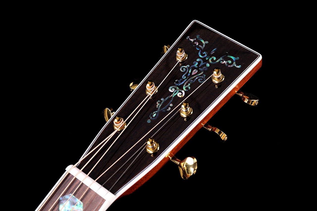 尺寸:41寸D桶 面板:A级云杉单板 背侧板:非洲桃花芯单板 面镶边:深海鲍鱼贝 琴颈:桃花芯 指板:玫瑰木 (镶嵌贝壳) 琴弦:磷铜镀膜-高抗氧化 琴钮:开放式高精度金色弦扭 琴枕:牛骨 油漆:高清亮光